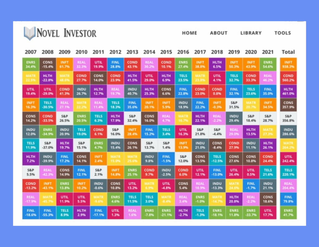 - Sectors for the most part, over the very long run, have annualized returns somewhere between 6-9% give or take. As you can see below, the last decade has seen a strong and long bull run, not entirely normal with exaggerated positive returns. Certain sectors like technology have overperformed. It was in the number one position in 2017, 2019, and 2020 and although it placed fourth in 2021 it was a very strong return.
